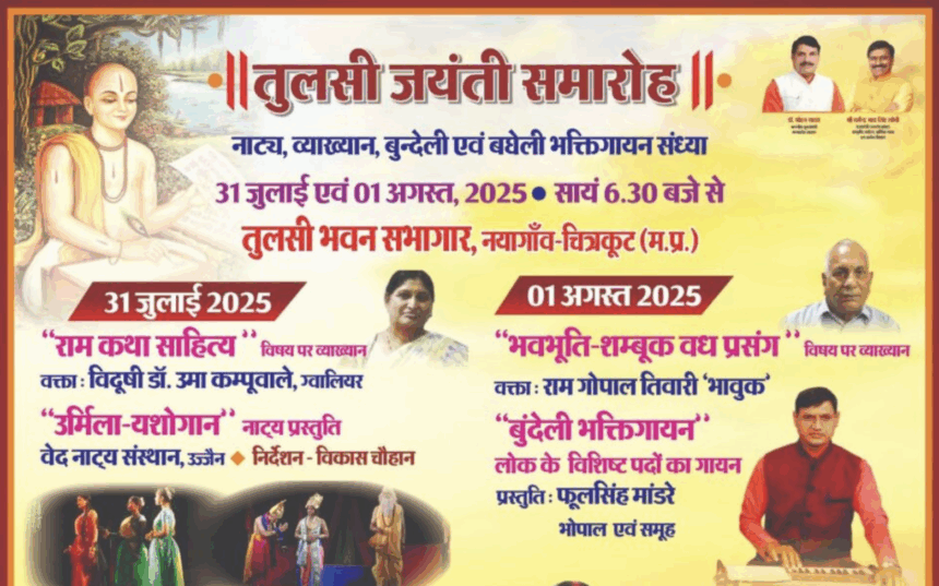चित्रकूट। मध्यप्रदेश शासन, संस्कृति विभाग की जनजातीय लोककला एवं बोली विकास अकादमी के अन्तर्गत संचालित तुलसी शोध संस्थान चित्रकूट द्वारा प्रतिवर्ष की भांति “तुलसी जयन्ती समारोह” आगामी 31 जुलाई एवं 1 अगस्त 2025 को आयोजित किया जा रहा है।