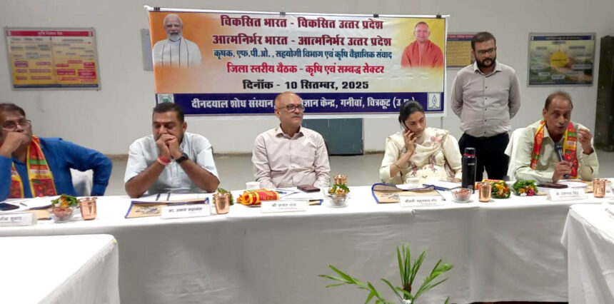 चित्रकूट। दीन दयाल शोध संस्थान द्वारा संचालित कृषि विज्ञान केंद्र गनीवां में विकसित भारत-विकसित उत्तर प्रदेश, आत्मनिर्भर भारत-आत्मनिर्भर उत्तर प्रदेश संकल्प 2047 के तहत जिला स्तरीय बैठक का आयोजन किया गया। बैठक में किसानों को विकसित भारत लक्ष्य में सहभागिता सुनिश्चित करने के लिए प्रेरित किया गया।